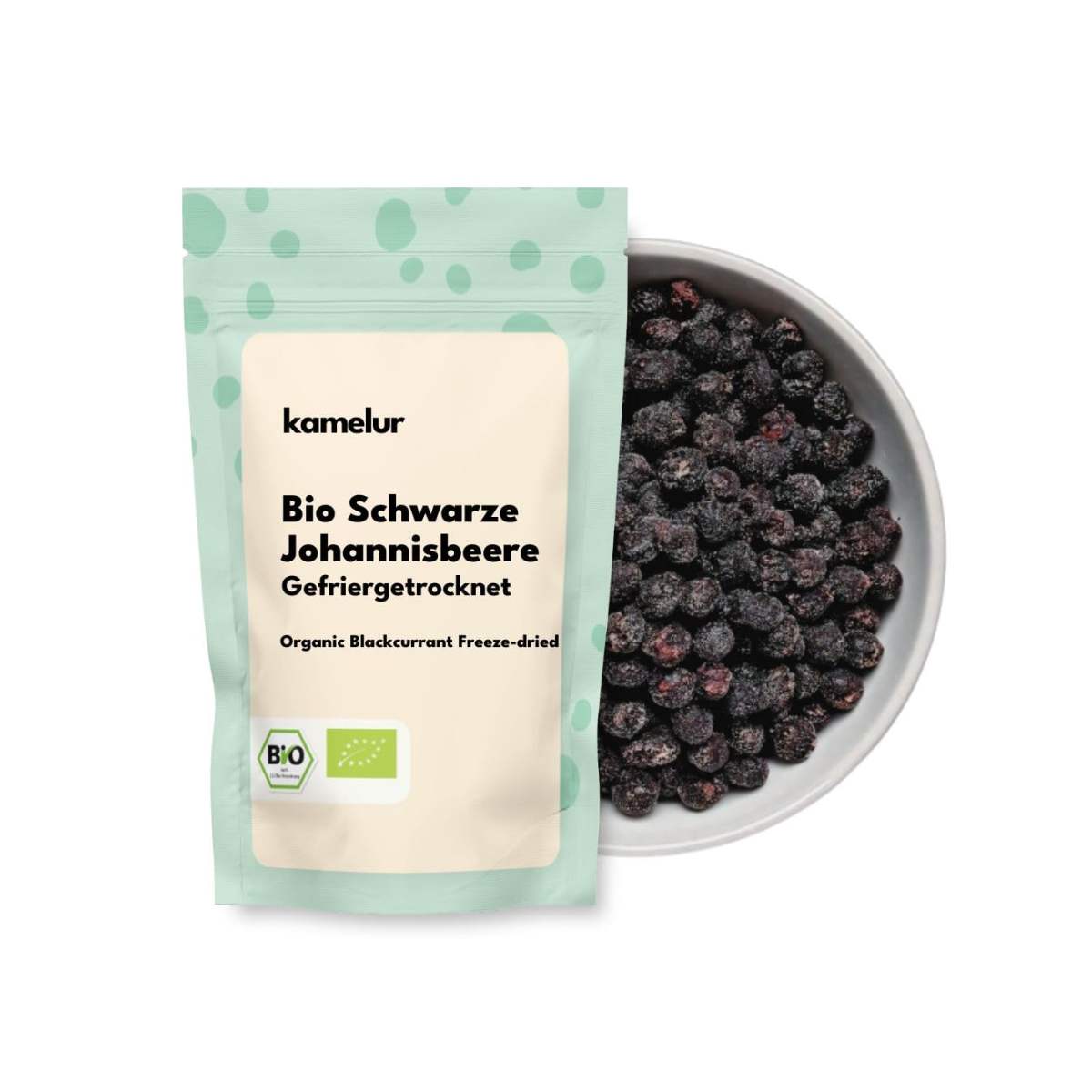 Diese schwarzen gefriergetrockneten Johannisbeeren von Kamelur sind in Bioqualität erhältlich.